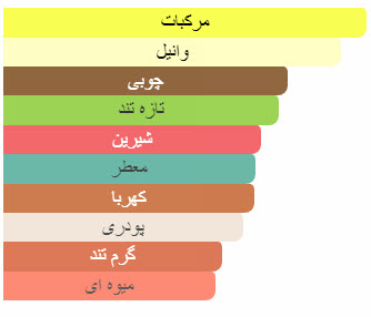 ![]() فلفل | ![]() سدر | ![]() پچولی | ![]() وتیور | ![]() یاسمن |