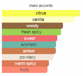 رایحههای اولیهی آن لیمو، هلو، زنجبیل، پرتقال ماندارین، اسطوخودوس و ترنج؛ رایحههای میانی آن فلفل، سدر، نعناع هندی، خس خس، یاس، چوب رز برزیلی، گل رز، گاردنیا، انیسون و فریزیا؛ رایحههای پایه آن وانیل، دانهی تونکا، چوب صندل، نارگیل، کهربا، بنزوئین، مشک، چرم و خزهی بلوط هستند.