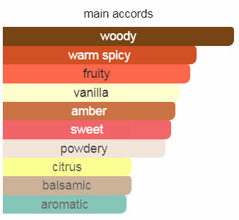 رایحههای اولیه آن هلو، پرتقال خونی، هل و گل آفتابپرست؛ رایحههای میانی آن داوانا ، یاس و (Rum) و (Cognac)؛ و رایحههای پایه آن وانیل، برگ نعناع هندی اندونزیایی، دانه تونکا، چوب صندل، بنزوئین، کشمیر، استیراکس، لابدانوم و خس خس است.