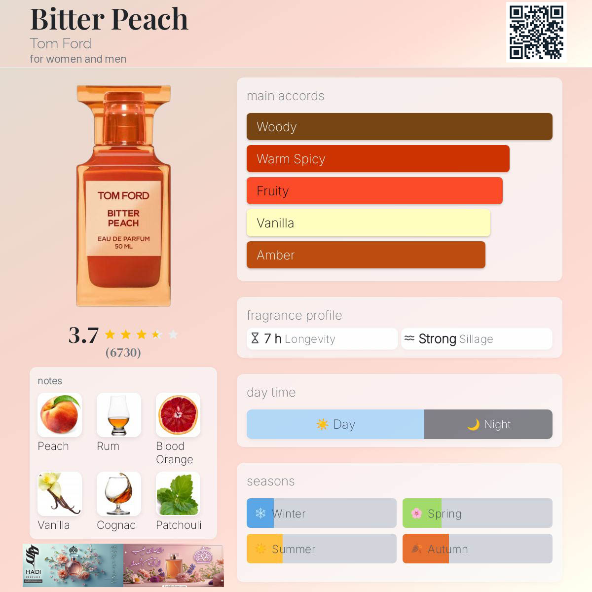 عطر بیتر پیچ Bitter Peach از برند تام فورد ، عطری شرقی با رایحه وانیل برای خانمها و آقایان است. نتهای اولیه آن هلو، پرتقال خونی، هل و گل آفتابپرست؛ نتهای میانی آن داوانا ، یاس و (Rum) و (Cognac)؛ و نتهای پایه آن وانیل، برگ نعناع هندی اندونزیایی، دانه تونکا، چوب صندل، بنزوئین، کشمیر، استیراکس، لابدانوم و خس خس است.