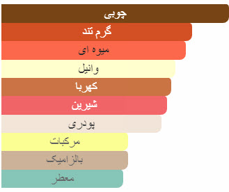 🌲 چوب صندل، 🌿 نعناع هندی (Patchouli)، 🍬 وانیل، 🍫 دانه تونکا، 🟤 بنزوئین، 🪵 کشمران، لبدانوم، خسخس