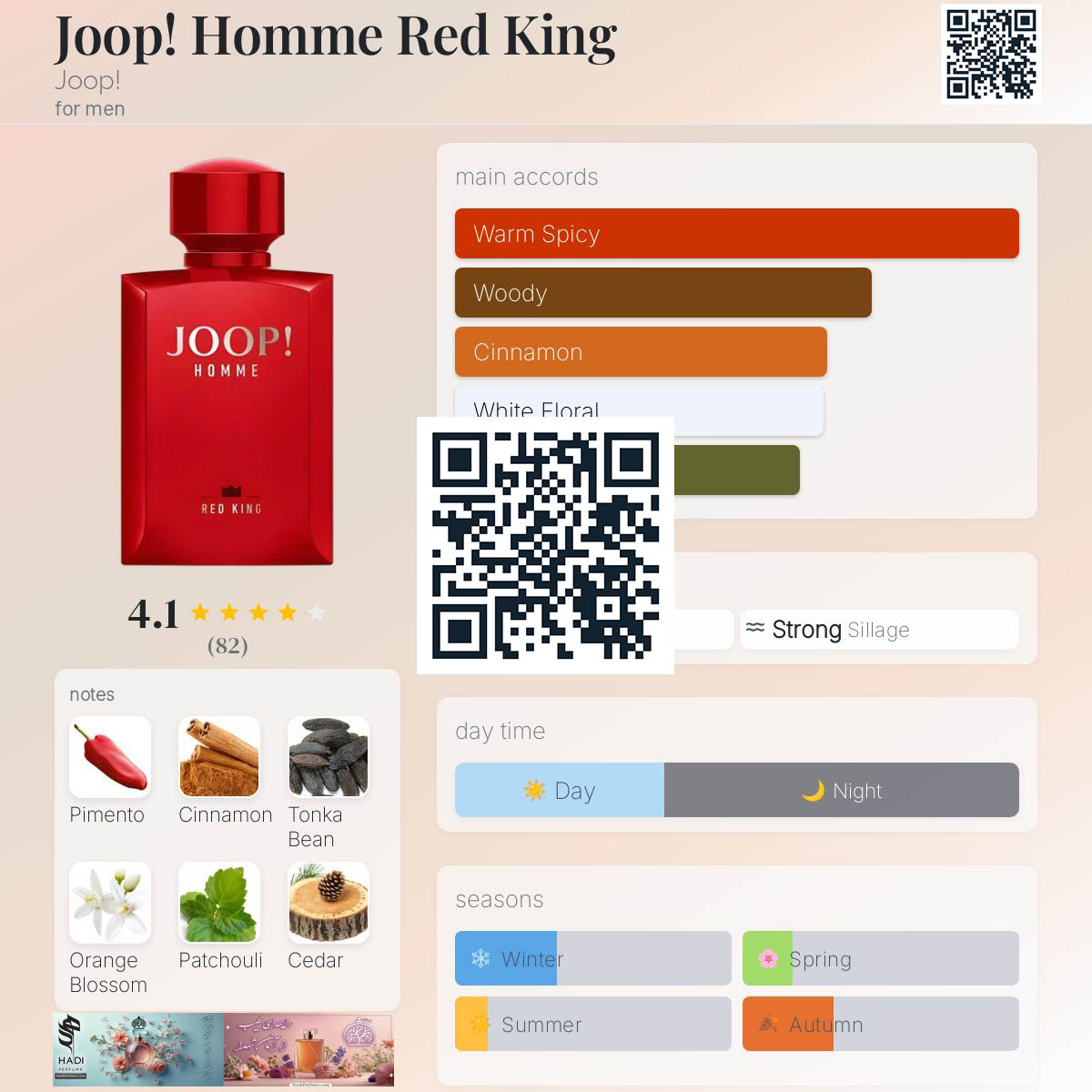 برخی مدلهای Joop! Homme (نسخههای قدیمی) رایحهای متفاوتتر از Red King دارند، اما Red King نسبت به آنها رایحهای تندتر و ادویهایتر دارد، مخصوصاً با نتهای فلفل و دارچین در شروع.
