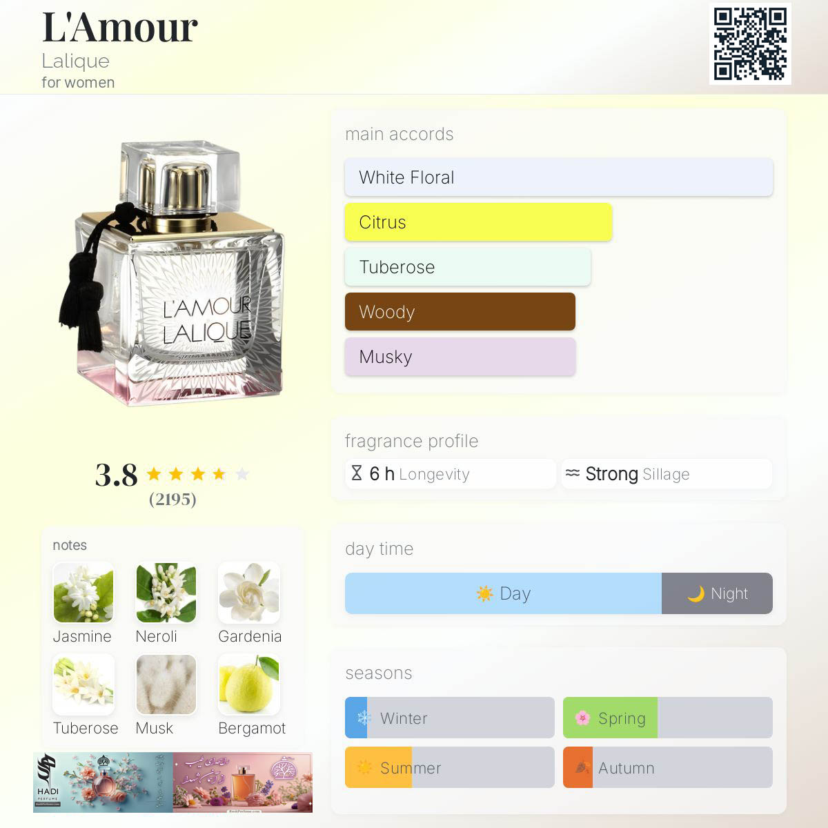 عطر زنانه لامور (L'Amour) از برند لالیک؛ با رایحه گلی، چوبی و مشک، در سال ۲۰۱۳ به بازار عرضه شد. نتهای اولیه آن شامل بهار نارنج، ترنج و گل رز؛ نتهای میانی آن شامل یاس، گاردنیا و گل مریم؛ و نتهای پایه آن شامل مشک، چوب صندل و سدر است.