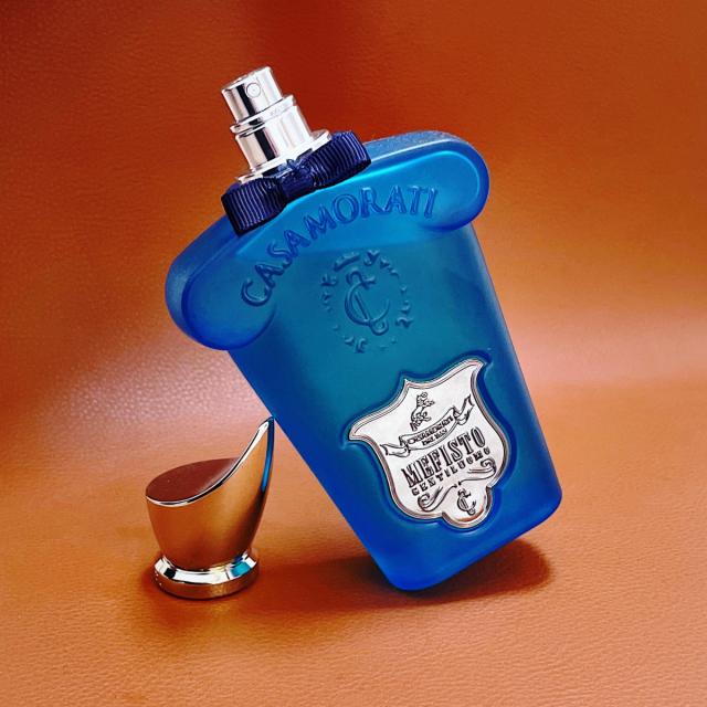 بسته‌بندی و طراحی بطری مفیستو نیز هماهنگ با روح سنتی آن است. شیشه عطر مفیستو با طراحی کلاسیک، رنگ آبی سلطنتی و درپوش طلایی‌رنگ، انگار از روی میز آرایش یک نجیب‌زاده قرن نوزدهم برداشته شده است. تمام جزئیات مفیستو کازاموراتی، از فونت نام‌گرفته تا نشان تاج‌مانند بالای شیشه، در جهت تداعی همان فضای اشرافی طراحی شده‌اند.