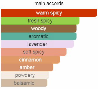 نتهای اولیه آن جوز هندی، دارچین، هل و گریپ فروت، نتهای میانی آن اسطوخودوس و نتهای پایه آن شیرین بیان، چوب صندل، کهربا، نعناع هندی و خس خس هائیتی هستند.