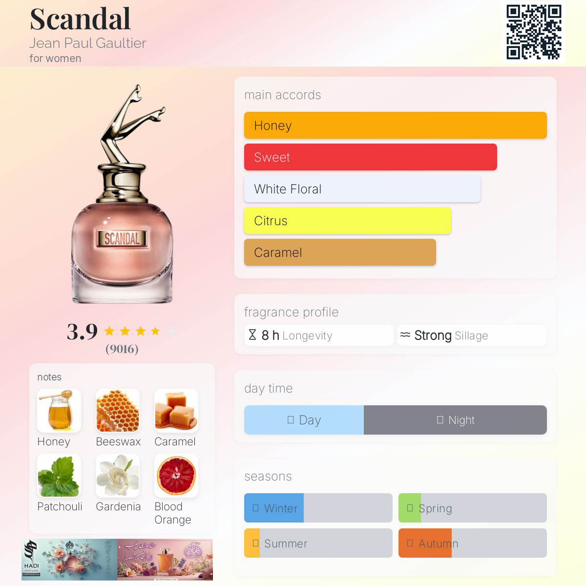 نت‌های میانی آن عسل، گاردنیا، شکوفه پرتقال، یاس و هلو